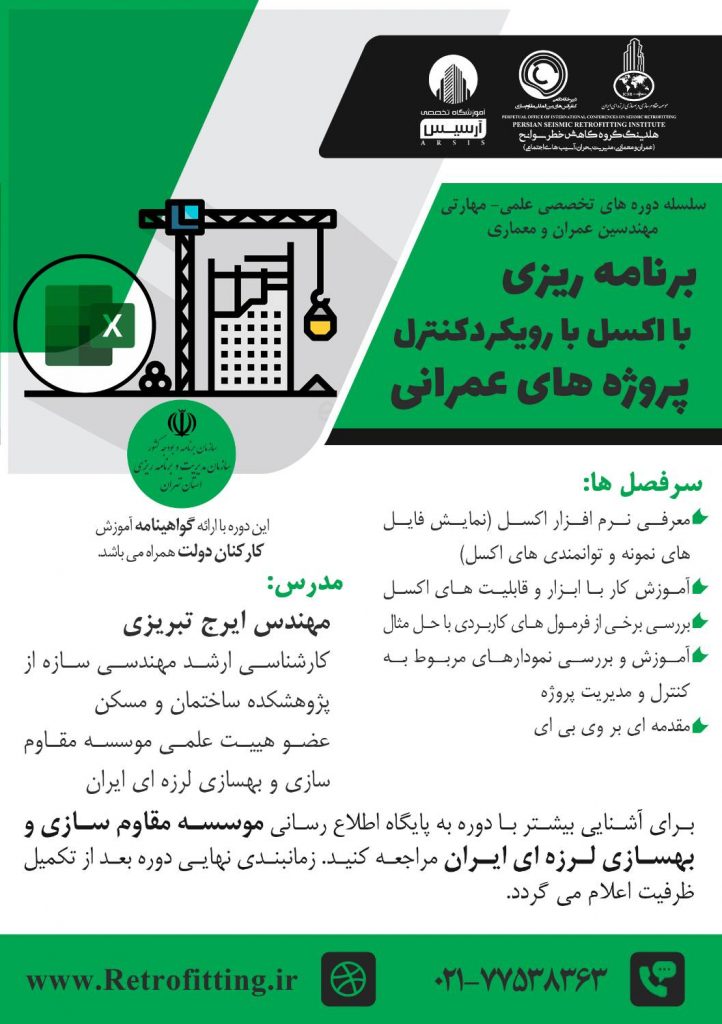 پیش ثبت نام دوره آموزشی مهارتی برنامه ریزی با اکسل با رویکرد کنترل پروژه های عمرانی آغاز شد. این دوره پس از تکمیل ثبت نام به مدت 6 جلسه 3 ساعتی به همراه آزمون و پروژه پایانی در مجموع به مدت 16 ساعت برگزار خواهد شد. حداقل ظرفیت ثبت نام برای تشکیل کلاس 8 نفر می باشد. این دوره همراه با ارائه گواهینامه معتبر از سازمان برنامه و بودجه استان تهران می باشد و دارای امتیاز آموزش کارکنان دولت است.