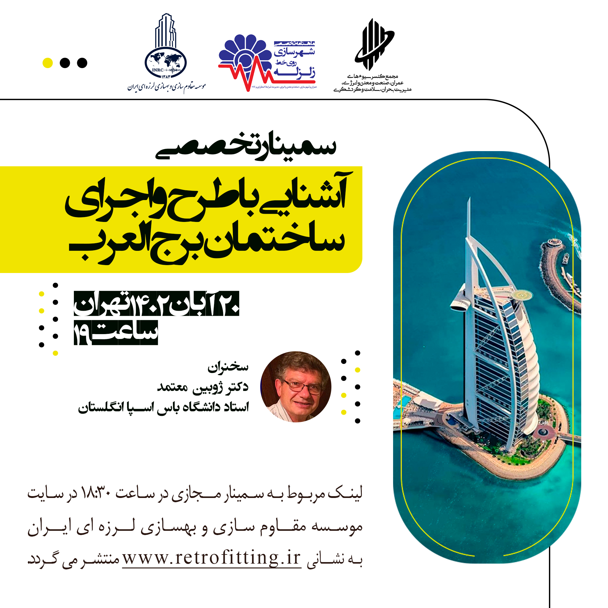 سمینار تخصصی آشنایی با طرح واجرای ساختمان برج العرب این سمینار با سخنرانی استاد ارجمند دکتر ژوبین معتمد (استاد دانشگاه باس اسپا انگلستان) به صورت برخط