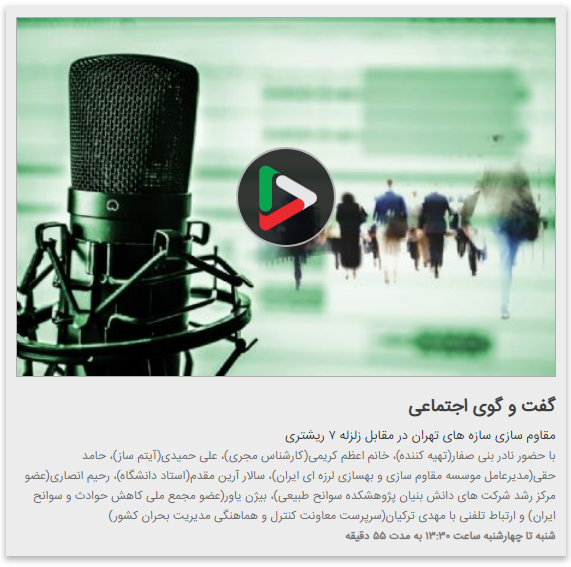 در گفتگوی اجتماعی رادیو گفتگو مورخ 23 مهر ماه 1402 به مناسبت هفته کاهش خطر حوادث و سوانح به بحث و بررسی پیرامون مقاوم سازی
